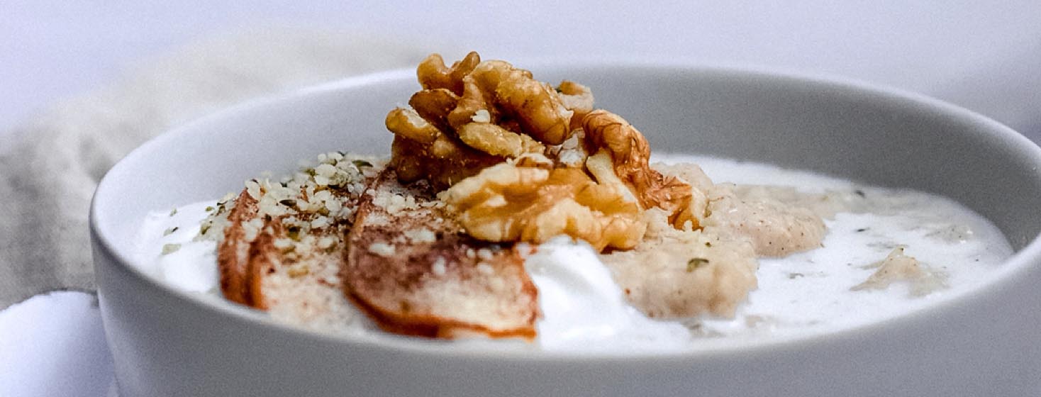 Millet is a 'grain' that's actually a seed, so it makes a great porridge option for people who find grains hard to digest or are eating gluten-free for their endometriosis. Millet contains lots of magnesium, calcium, and b-vitamins, which support hormone function, and is great to eat during the luteal phase. The addition of fruit, almond butter, yogurt and walnuts ensures that this is a well-balanced breakfast option.